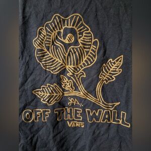 Casual Vans Lizzie Armanto crop muscle tank top in dark blue. Gold flower graphic. Ideal for everyday wear. Pairs well with jeans.