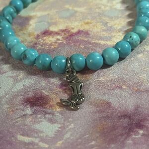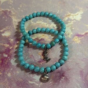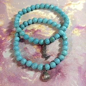 Set of two turquoise beaded bracelets. Features unique charms. One is a mermaid and the other is a sea shell! Perfect for adding a pop of color.