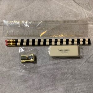 NWT ———— This Kate Spade zipper pouch doubles as a super cute pencil pouch, filled with Kate Spade branded accessories. You’re going to LOVE the iconic Kate Spade black and white stripe pencils, an eraser, pencil sharpener, and a branded 6” ruler. Office supplies never looked so good!