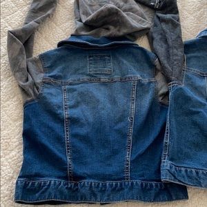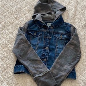 Stylish kids denim jacket with a cozy hood. Features a classic blue denim body and contrasting gray sleeves. Perfect for casual outings.