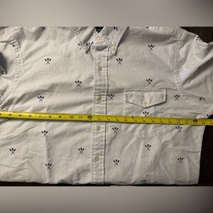 Stylish Ralph Lauren shirt with subtle blue stripes. Features skull and paddle crossbone details. Perfect for casual outings.