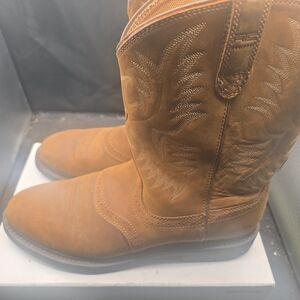 Classic Ariat boots with intricate stitching. Durable leather construction. Ideal for everyday wear.