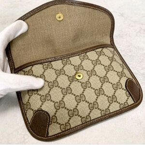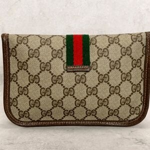 Elegant Gucci pouch with signature monogram design. Features striking red and green stripe. Ideal for versatile use.