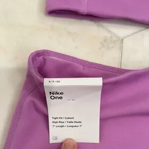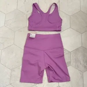 Stylish purple sports bra and shorts set. Features Nike logo. Comfortable and sleek design.