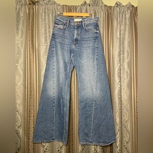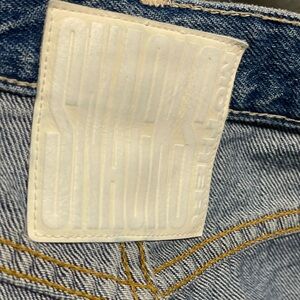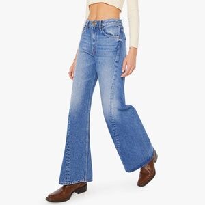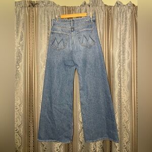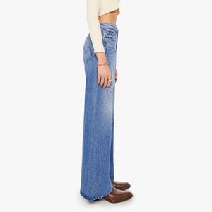 Wide leg jeans from SNACKS!, a collection of unconstrained silhouettes leaning into exaggerated shapes and extreme proportions. Experimental and non-era specific. For everyone, or not. Designed to sit on the hips with a slouchy fit, these super high-waisted jeans have a loose wide leg with a curved outer seam and a long 32-inch inseam with a clean hem. Made from a rigid recycled cotton blend, Rolling In The Dough is a mid-blue with a pretzel-detailed button and candy-inspired interior rivets.