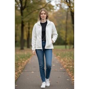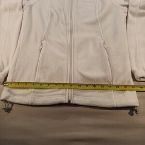 Women’s Columbia full-zip fleece jacket featuring the Breast Cancer Awareness ribbon embroidery on the chest. Soft fleece with a cozy feel, high collar, zip-front design, and two zip pockets. Adjustable hem toggles for a better fit. Jacket is in great condition with no major wear.