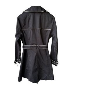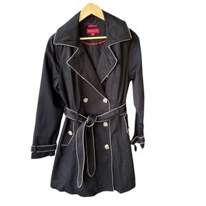 Merona black trench coat. This classic outerwear piece offers a water-repellent finish for unexpected drizzles, ensuring you stay chic and dry. The double-breasted front and belted waist create a flattering silhouette, while the piping adds a touch of refined detail. Perfect for transitioning between seasons, this elevates your everyday style for commutes, weekend outings, or elegant evenings.