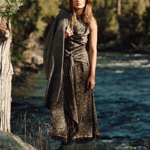 In a luminous silk satin adorned with our Fleur de Majorelle print—an 18th-century brocade-inspired floral—the Cataline Dress features a high bateau neckline, vintage seaming details, and faux knots at the bodice. A trailing scarf extends down the front of the skirt, finished with silk fringe. A single covered button fastens at the back of the neck, while an invisible side zipper ensures the perfect fit.