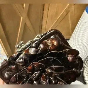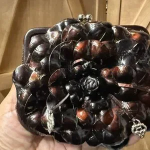 Elegant brown leather clutch with floral design. Features silver accents.