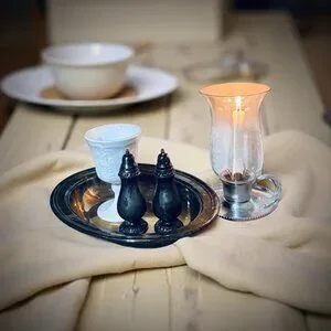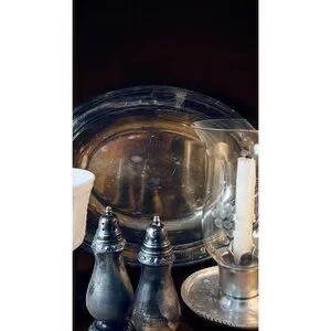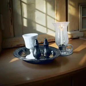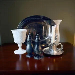 Create an instant “finished” look with this curated silver and white set. You’ll receive a vintage silverplate oval serving bowl, a milk glass goblet, a pair of weighted silverplate salt and pepper shakers, and an aluminum candle holder with an etched glass globe. Together, they feel like a treasured collection built over years of hunting, but you get it all in one box.