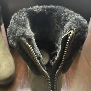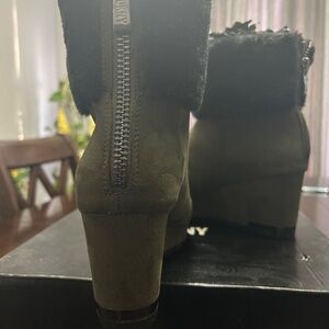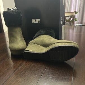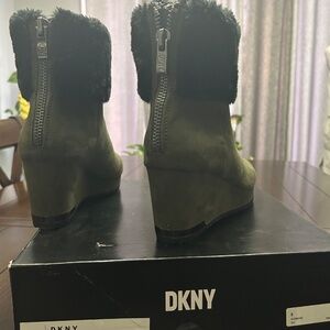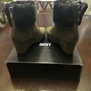 New in Box. DKNY Nadra-Wedge Bootie, Faux Cow Fur, Camo Green/Blk