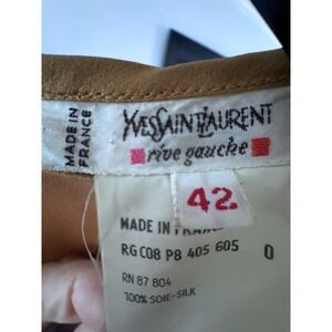 The product is a vintage Saint Laurent Rive Gauche mustard silk blouse top from Yves Saint Laurent, a prestigious French fashion brand. This blouse is designed in a classic style with a regular size 42 fit. The luxurious silk material and exclusive color make it a stylish and high-quality addition to any woman's wardrobe. Perfect for adding a touch of elegance and sophistication to any outfit, this blouse is a timeless piece that exudes luxury and fashion-forward style.