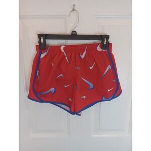 The Nike Girls Dri-Fit Tempo Allover Swoosh Print Running Shorts in size Large are a vibrant choice for young girls who love to stay active. Made of polyester material and featuring a solid red color with a colorful Swoosh print, these athletic shorts are perfect for running, training, or everyday casual wear. The flat front design and lined interior add comfort and style, making them a versatile addition to any girl's wardrobe for all seasons. Machine washable and easy to care for, these Nike shorts combine performance and fashion for young active individuals.