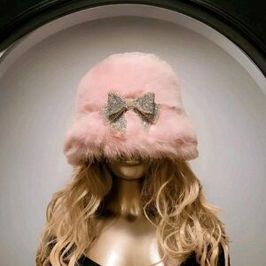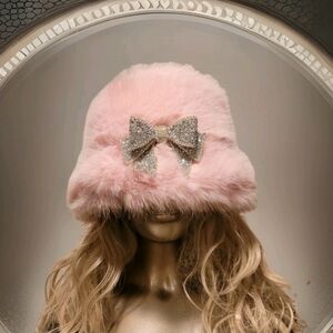 NWT Soft Pink Super Furry Faux Fur Winter Bucket Hat w/ Vtg. Crystal Bow Brooch