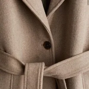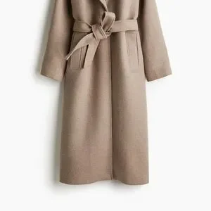 Stylish long coat with a tie belt. Features a classic tan color.