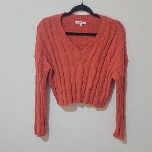 Stay cozy and stylish with this vibrant orange cable knit sweater. Perfect for any casual outing.