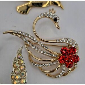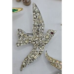 This is a lot of 9 bird-themed brooches and pins. They are all in good condition, all wearable, some may have a little wear, but it's nothing bad. Some are vintage and some are modern. As of the moment I made this listing, there were no rhinestones missing on any pieces. Includes vintage silver tone flying bird with rhinestones, gold tone rooster with rhinestones in excellent condition, pewter dove with gold wreath, Artisan copper colored bird with wear, cloisonné swan, Sarah Cov AB rhinestone hummingbird with wear, gold tone enamel parrot in excellent condition signed LC, gold tone rhinestone swan (looks like a Swarovski piece, but I don't see any markings), vintage button bird on a fence plastic, gold tone hummingbird with some wear to the enamel but it isn't noticeable, gold tone flying bird with some surface wear, but not bad. Please see all photos, smoke-free home.