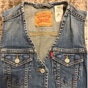 Iconic Levi Strauss Co denim vest defines effortless cool with its classic blue jean wash and timeless silhouette. Two chest pockets with button closures offer practical style, while the front button placket and expertly crafted seams create a flattering fit. The slightly distressed finish and raw hem add a touch of rugged charm.