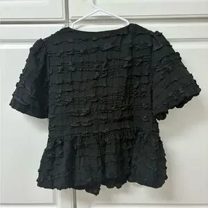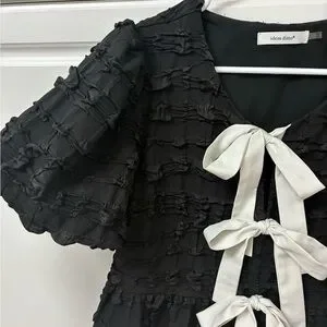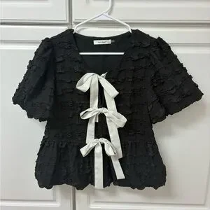 Discover elegance with this stunning black blouse, adorned with charming white bow accents. A perfect addition to your wardrobe for a touch of sophistication.