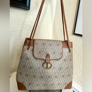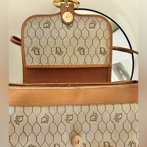 Gorgeous, timeless luxury Christian Dior bag, featuring the brand's iconic signature "Honeycomb" pattern on canvas with brown leather trim