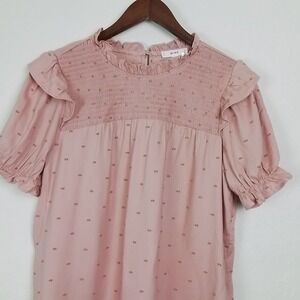 Anthropologie MINE Boho Smocked Ruffle Puff Sleeve Blouse Pink Dot size L