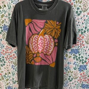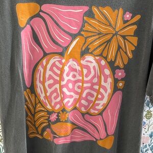 Short sleeve tee with vibrant pink and orange graphic. Soft and comfortable fabric.
