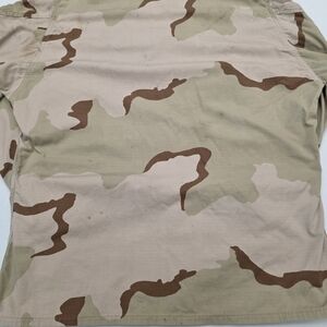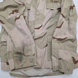 US Navy camouflage jacket with button closure. Features a classic military design. Has oil staines on it from mechanic work. It has been washed and cleaned but they should come out with every wash. Perfect for combat, work, airsoft and paintball events.