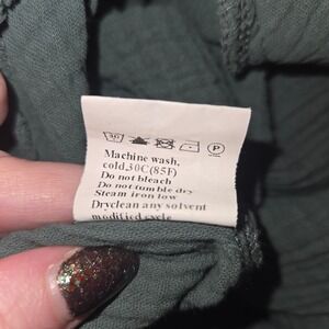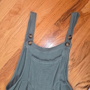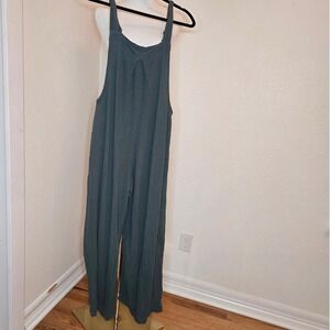 This sage green cotton jumper features a relaxed, flowy silhouette with wide legs and adjustable button straps. Made from lightweight crinkle gauze cotton, it has a soft, breathable feel that drapes beautifully and offers all-day comfort.