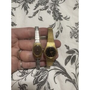The product is a Lot of 2 Vintage Seiko Women's Gold/ Silver Tone Quartz Watches, which are of classic style and suitable for both dress/formal and casual occasions. These watches feature a smooth gold bezel, stick and baton indexes, and a bracelet band with a jewelry clasp closure. The watches are made of stainless steel and gold plated material, with a polished case finish and water resistance. The vintage Seiko watches have a mineral crystal, central second, and a 12-hour dial, making them stylish and functional timepieces for women.