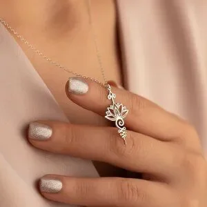 Necklace features a Lotus Flower crafted from metal alloy with silver tone rhodium plating hanging from an 18 inch steel cable chain with 2 inch extension and lobster claw clasp closure.