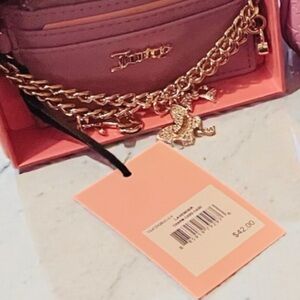 This coordinated duo features Juicy’s signature embossed logo pattern, soft pink colorway, and luxe gold-tone hardware—perfect for everyday glam or collector appeal.