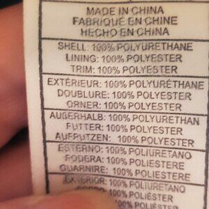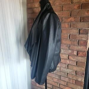 This moto-style jacket features a draped front with a wide, notched collar/lapel and an asymmetrical zip-front closure. It typically has long sleeves, a slightly cropped length, and front zip pockets. The material is a polyurethane blend to give it the look and feel of leather (vegan/faux leather) and has a polyester satin-like lining.