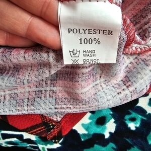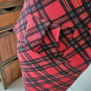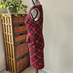 Cute plaid dress with front peplum at the waist and back zipper. This has a lot of stretch. The bust measures 17" flat, waist is 13" and the length is 37".