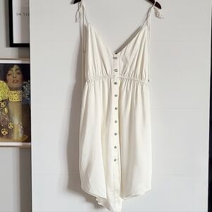 Retrofête's 'Diane' dress has dainty tie-fastening straps that frame the low v-neckline and falls to an asymmetric handkerchief hem. Color is white.
