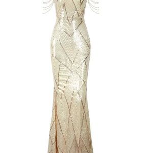 A sleek sequin gown featuring a halter neckline and figure-hugging silhouette, designed to highlight curves with refined sparkle.