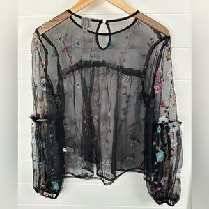 A New Day Floral Embroidered Sheer Mesh Long Frilled Puff Sleeve Blouse