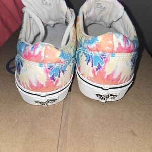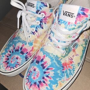 NEVER worn. literally bought them and they sat in front of my dresser until now. Colorful Vans sneakers with a vibrant tie-dye pattern. Features a mix of blue, pink, and yellow hues.