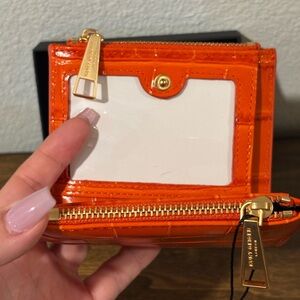 Vibrant orange wallet with croc-embossed texture. Gold-tone hardware. Compact and stylish design.