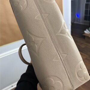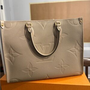 Mint condition Louis Vuitton On-The-Go MM tote in Turtledove. Features signature embossed design. Perfect for any occasion.