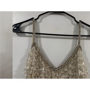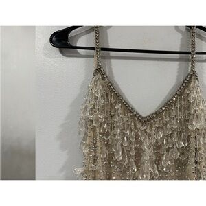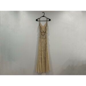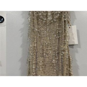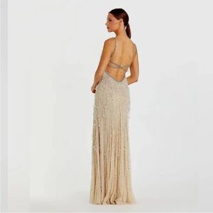 Mac Duggal 10101 Nude Silver V-Neck Column Gown with Fringe Embellishments Sz 0