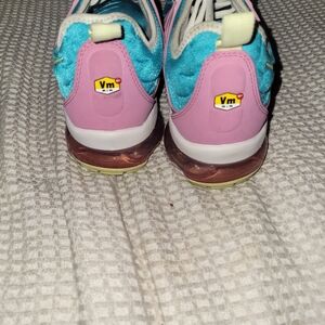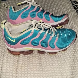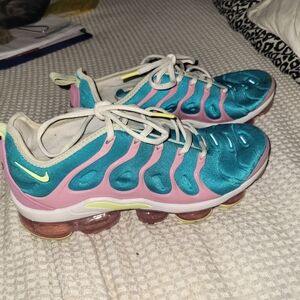 Step out in style with the Nike Women's Air VaporMax Plus Sneakers. Featuring a vibrant mix of teal, pink, and yellow, these shoes offer both comfort and flair. Perfect for any casual outing. fair condition with normal wear. no box.