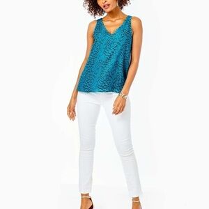 Tags: Resort Wear, Preppy, Coastal Chic, Tropical Luxe, Bright & Bold, Vacation Style, Palm Beach Chic, Dopamine Dressing, Lilly Pulitzer Silk, Florin Top, Teal Silk Tank, Reversible Top, XXS Lilly Pulitzer, NWT Designer Top, Silk Clip Dot, Summer Party Top, Tropical Print, Bright Teal Blouse, Luxury Travel Wear.