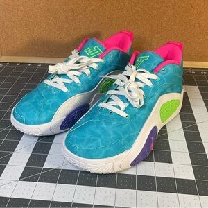 Vibrant sneakers with a mix of turquoise, pink, purple, and green accents. Perfect for a bold look.
