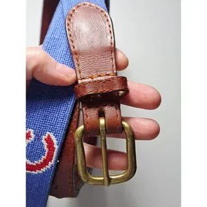 This Smathers & Branson belt combines high-quality hand-stitched needlepoint craftsmanship with durable leather, offering both style and functionality. The blue canvas features an eye-catching red "C" logo pattern and a sturdy brass buckle for a polished look. Ideal for adding a refined touch to casual and semi-formal outfits.