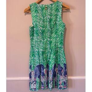Keywords: Lilly Pulitzer dress, sleeveless dress, green dress, blue dress, printed dress, casual dress, party dress, summer dress, vacation dress, women's dress, size small, v-neck dress, designer dress