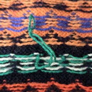 There is a small flaw: a snag on the green thread on the inside. It does not impact the outside quality of the sweater.