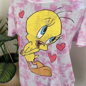 Looney Tunes Womens Pink Tie Dye Tweety Bird Distressed NWT