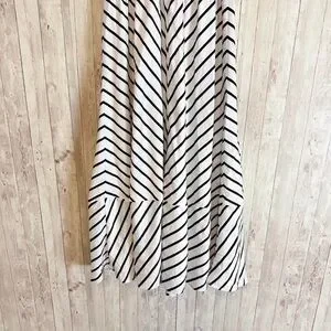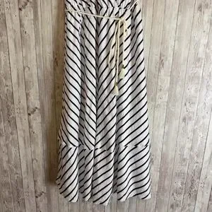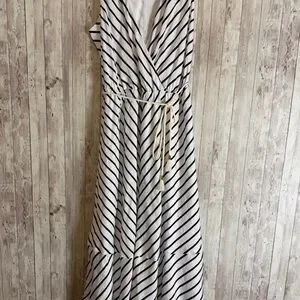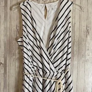 Size petite medium J. Jill heather v-neck sleeveless navy striped dressed with tasseled rope belt. Lenzing Ecovero Viscose and nylon with rayon lining.
