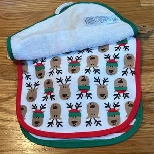 Charming bib set with playful reindeer theme. Features festive colors and fun designs. Ideal for joyful occasions.