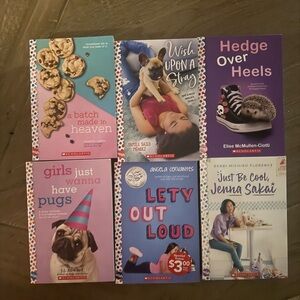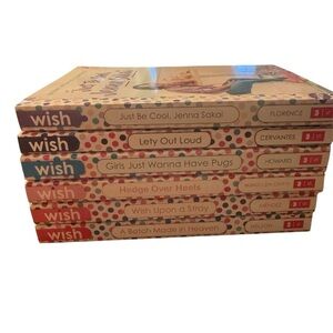 Set of six Wish books with colorful polka dot spines. Includes titles like 'Just Be Cool, Jenna Sakai' and 'Girls Just Wanna Have Pugs.'